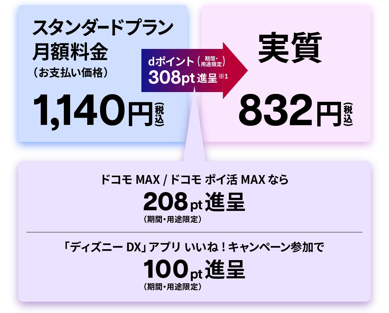 ドコモ回線でディズニープラスをご利用中の方なら、スタンダードプラン(月額1,140円税込)も、各種ポイントバック(308pt※1)により、実質832円(税込)でお楽しみいただけます!
