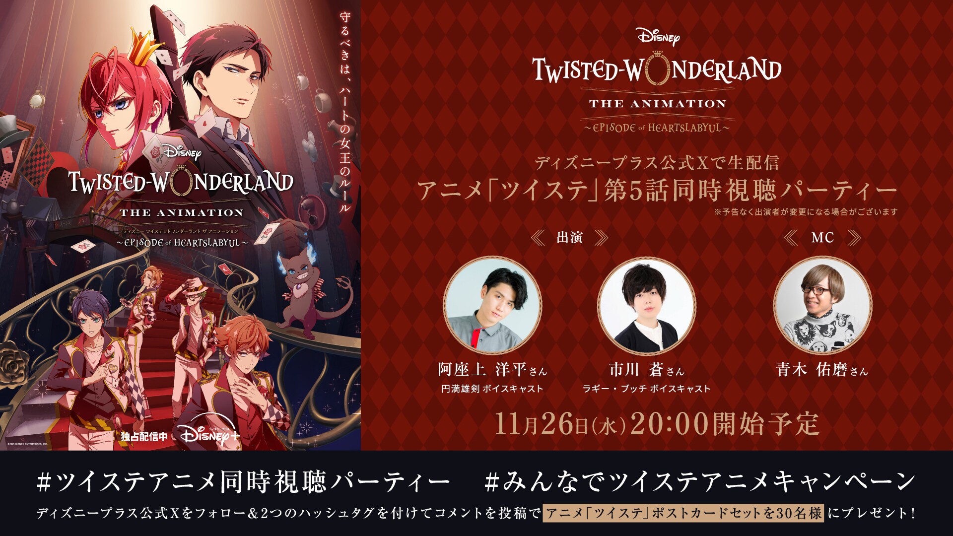 そしてなんと、11月26日(水)20時より、スペシャルゲストに本作のボイスキャストである阿座上洋平さん(円満雄剣)と市川蒼さん(ラギー・ブッチ)を迎え、【ツイステアニメ同時視聴パーティー】をディズニープラス公式Xにて開催!