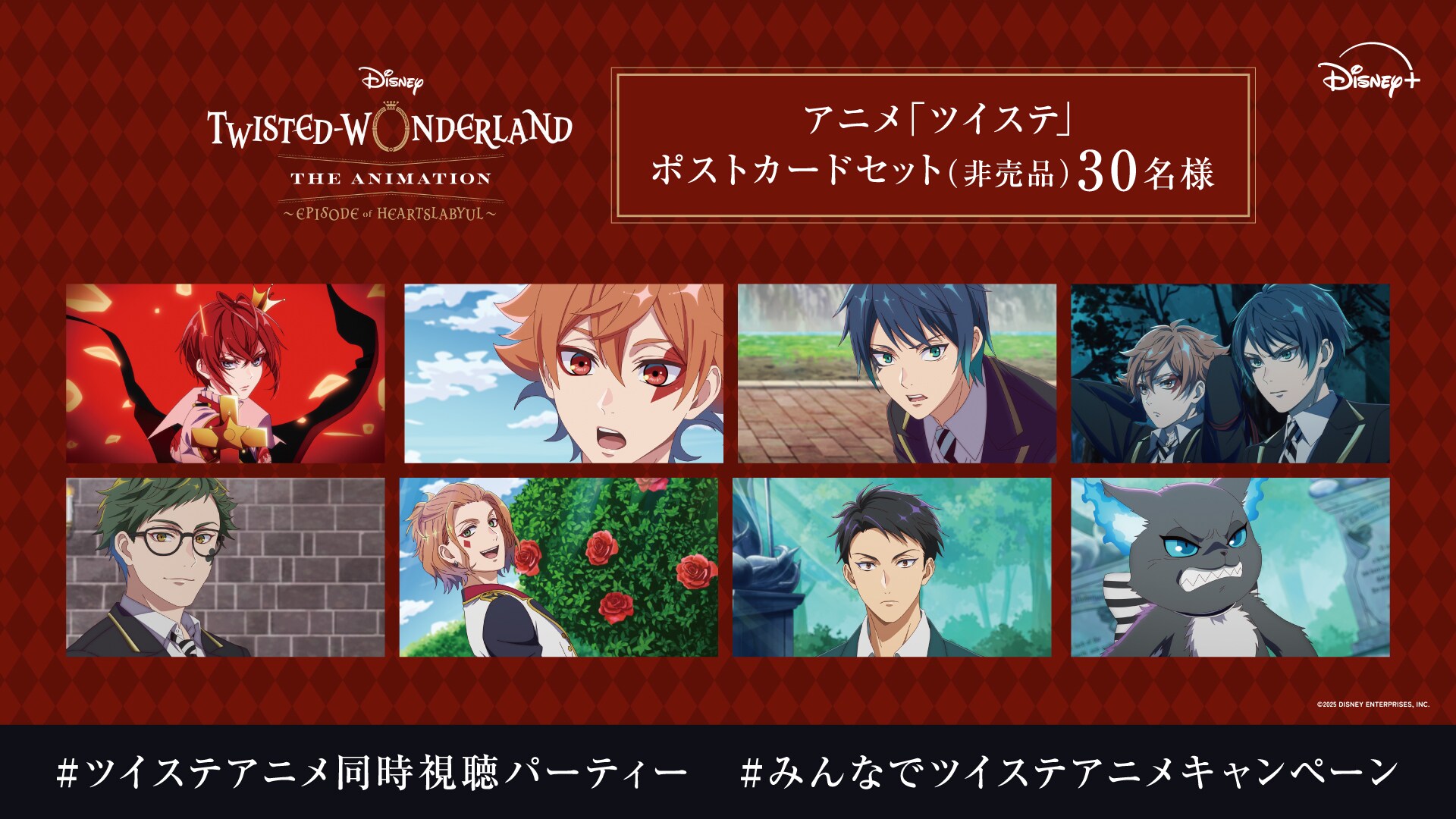 X(Twitter)にて #ツイステアニメ同時視聴パーティー & #みんなでツイステアニメキャンペーン のハッシュタグをつけて【ツイステアニメ同時視聴パーティー】へのコメントや本作への感想を投稿いただいた方の中から、アニメ「ツイステ」ポストカードセット(非売品)を30名様にプレゼント!