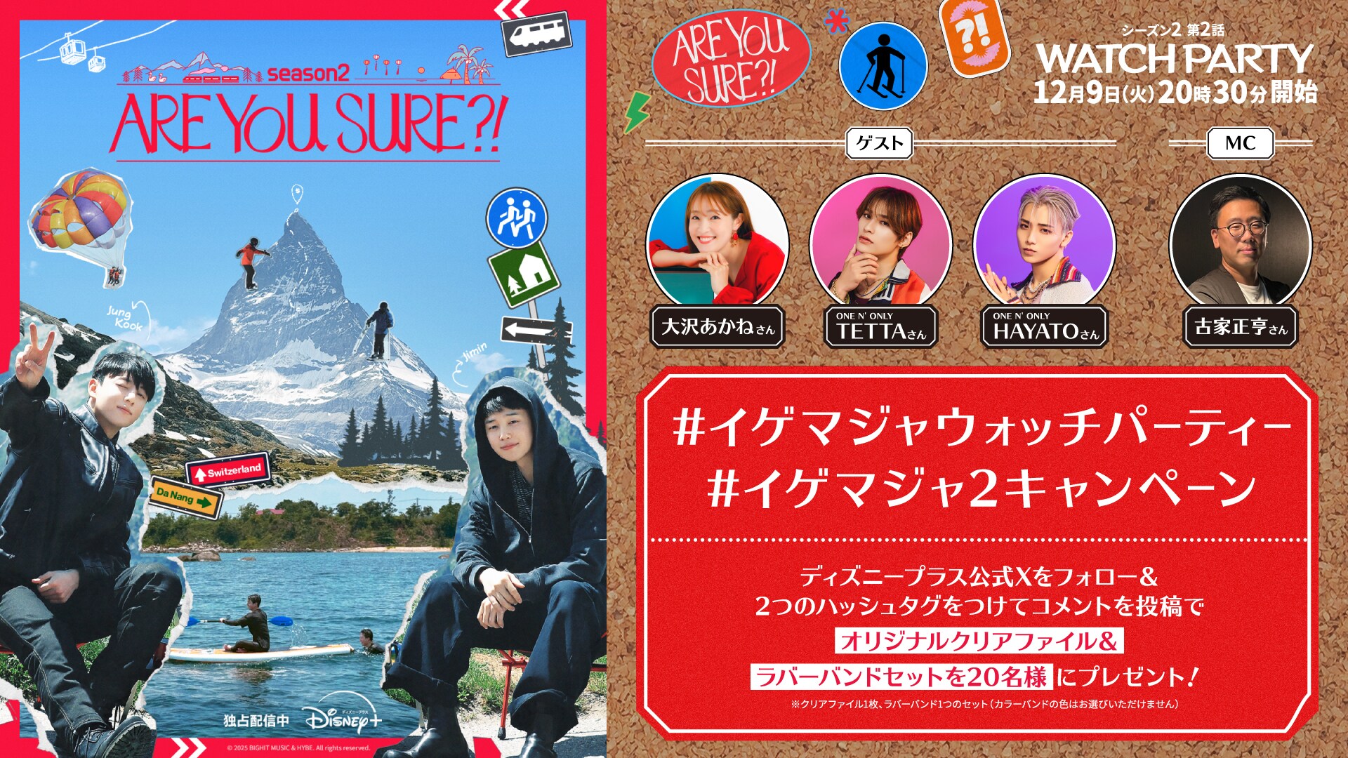 『Are You Sure?!』シーズン2配信を記念して、12月9日(火) 20:30よりONE N’ ONLY(ワンエンオンリー)のTETTAさんとHAYATOさん、そして大沢あかねさんをゲストに迎え【イゲマジャウォッチパーティー】をディズニープラス公式Xにて開催!シーズン2 第2話をみんなで一緒に楽しもう!