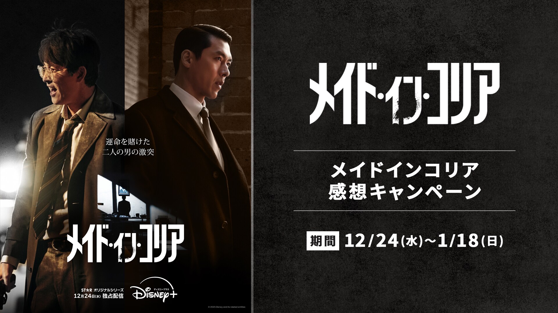 ヒョンビン(「愛の不時着」) × チョン・ウソン(「私の頭の中の消しゴム」) の豪華共演!予測不能な追跡劇を映画級のスケールで描くノンストップ・チェイス・エンタテイメント『メイド・イン・コリア』がディズニープラス スターにて12月24日(水)より独占配信開始。