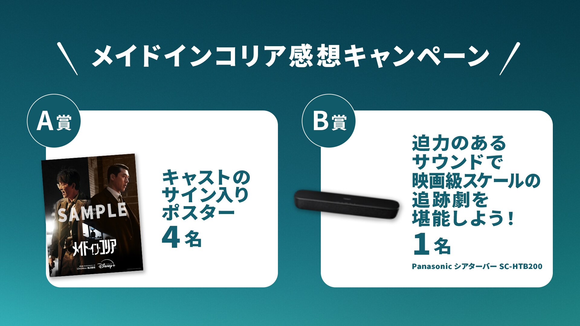 ディズニープラス スター『メイド・イン・コリア』の配信を記念して、4週連続の感想投稿キャンペーンを実施。参加いただいた方の中から、ヒョンビンとチョン・ウソンのサイン入りポスターなど豪華賞品を合計5名様にプレゼント。