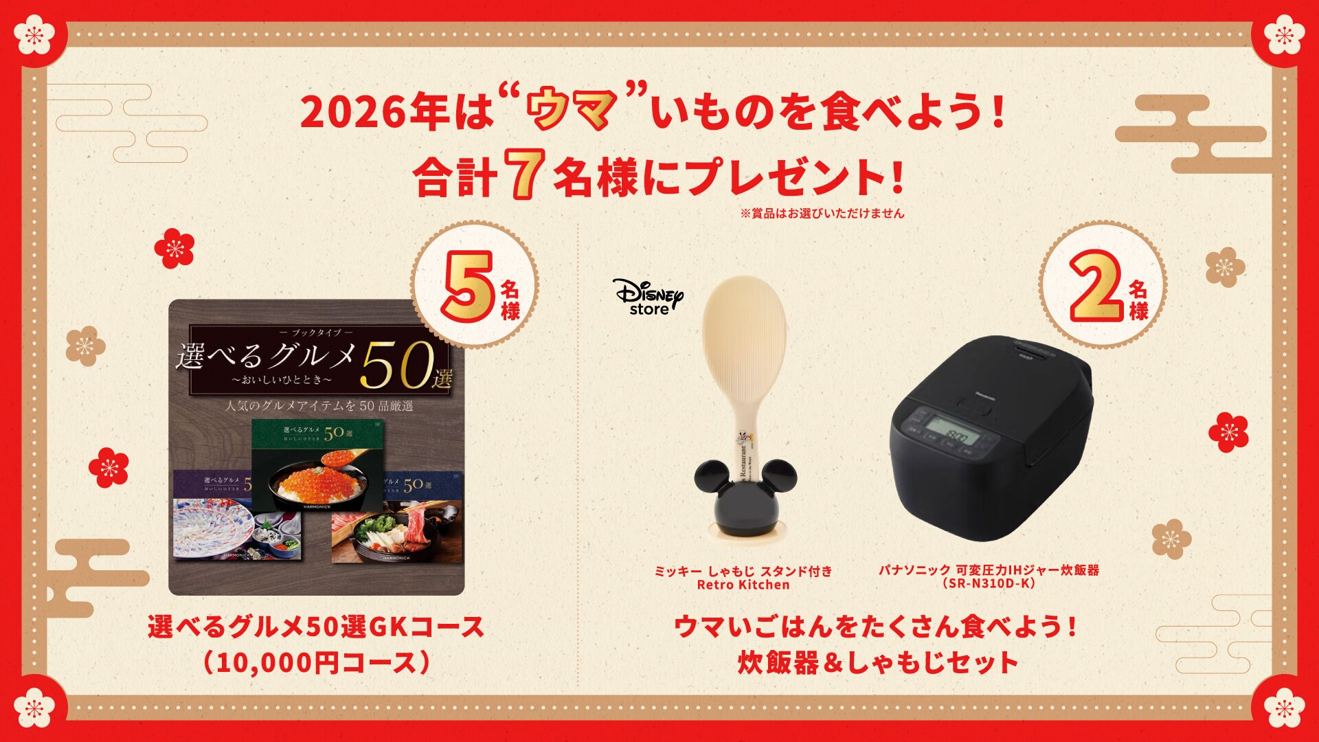 参加者の中から7名様へ「2026年は“ウマ”いものを食べよう!」をテーマに、「選べるグルメ50選GKコース (10,000円コース)」や「ウマいごはんをたくさん食べよう!炊飯器&しゃもじセット」をプレゼント!