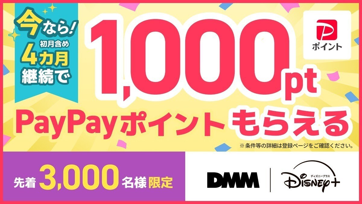 キャンペーン期間中にDMM | Disney+ セットプランに登録し4カ月継続いただくと、先着3,000名様にPayPay1,000ptをプレゼント!