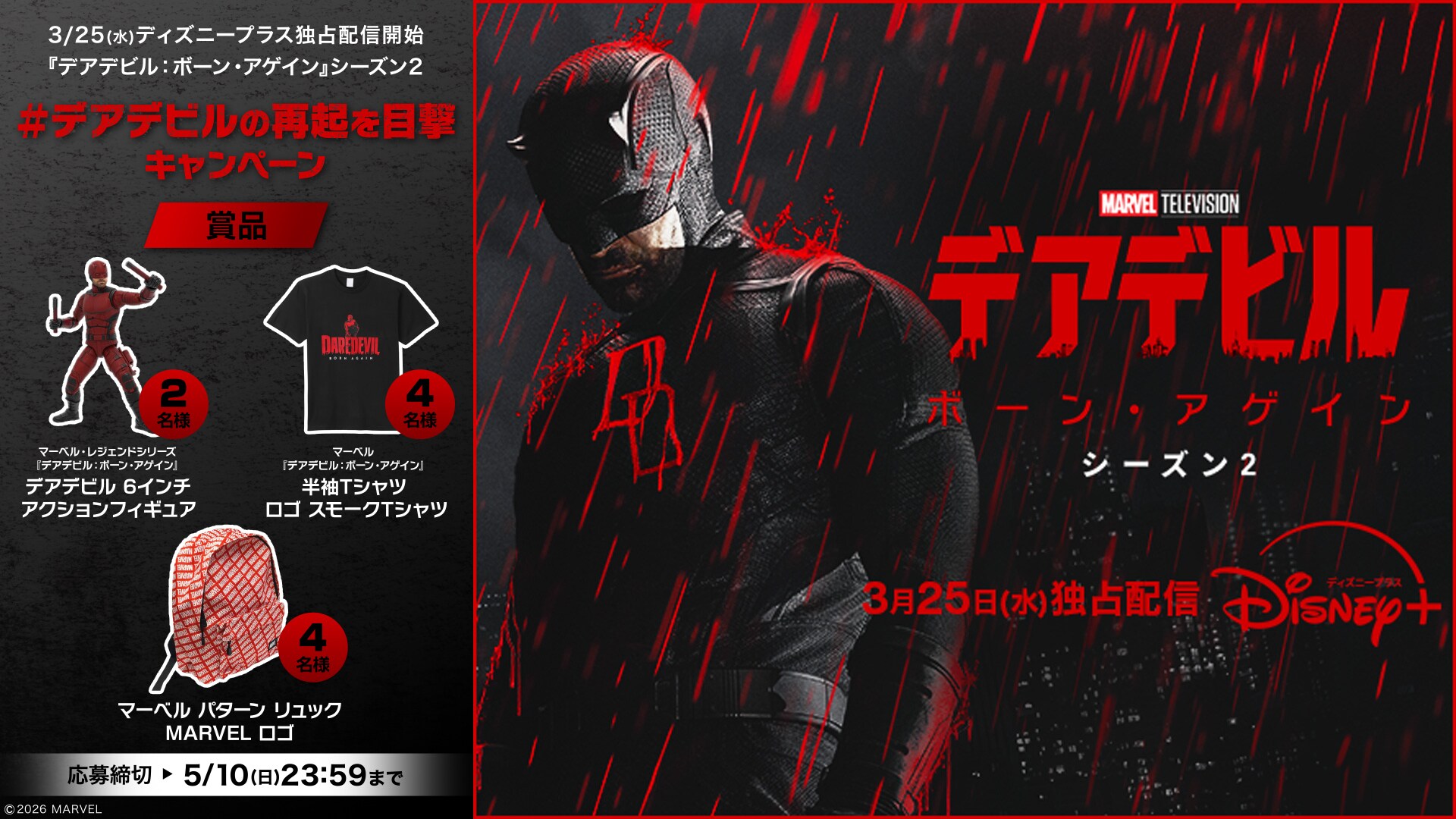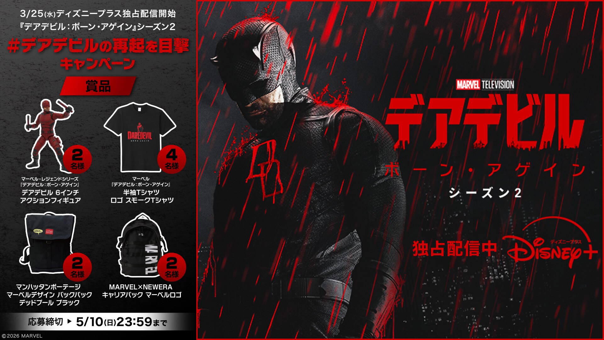 『デアデビル:ボーン・アゲイン』シーズン2の配信を記念して、マーベル・スタジオ[公式]X(@MarvelStudios_J)をフォロー&指定ハッシュタグを付けて期待や感想コメントをXに投稿すると、豪華プレゼントが当たるキャンペーンを実施。