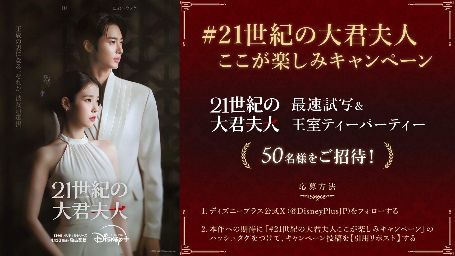 2026年4月6日(月)に行われる<『21世紀の大君夫人』最速試写&王室ティーパーティー>に、ディズニープラス公式X(旧Twitter)アカウントフォロワーの方の中から50名様をご招待。